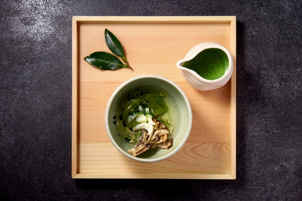 希少価値の高いプレミアムティーにはじまり碾茶葉をそのまま味わう料理まで、総料理長 松勢良夫が京都の食文化を語るのに欠かせないお茶を軸に組み立てたディナー会席です。高級茶「辻喜」の抹茶を使用したメニュー「辻喜」は、抹茶のラビオリと茶筅に見立てた舞茸を抹茶椀に盛り付けてご提供。そのほか乾燥させた碾茶葉をご飯に振りかけて本来の碾茶の味をそのまま味わえるお食事など茶葉の旨味を料理で存分にご堪能いただけます。また、ペアリングのお飲み物にはプレミアムな日本茶を中心に、国産ワイン、日本酒などをお料理に合わせて提供いたします。本物とイノベーションを掛け合わせた、唯一無二の食体験をご堪能ください。