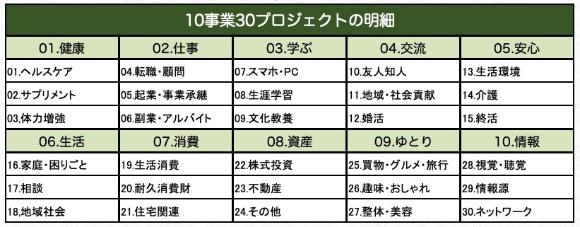 「この指とまれ!」では、プラチナ世代が抱える課題やニーズを解決するために、5年間かけて10事業30プロジェクトからなる商品・サービス・情報等を提供する事業を自らが主になって立ち上げます。そして、その事業基盤になるツールとして、プラチナ世代専用ECプラットフォームを新たに開発いたします。