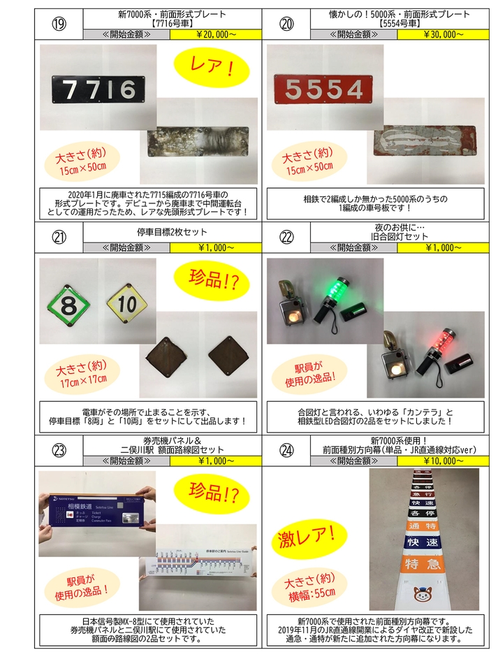 当日は、大和駅長と駅係員がオークションのオークショニア(司会)を務め、運転士や車掌などを経験した駅係員が、実物や写真などで商品を紹介します。今回の商品は、大和管区にゆかりのある駅名標や廃車となった電車の部品など、普段ではなかなか手に入らない鉄道用品全30点をご用意。ご参加の皆さまには、オンライン会議システム「Zoom」のチャット機能を使用し、入札していただきます。