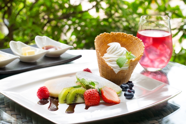 シェフが目の前で焼き上げる焼き立てパンケーキに爽やかな甘さののオリジナルソフトを添えて。キレイになるお茶と一緒に午後のティータイム。美肌成分を多く含む、ホエイを混ぜ込んだパンケーキと伊豆ぐり茶や、伊豆アロエ茶など選べるお茶で、優雅なひとときをお過ごしください。 (鉄板焼「青竹」14:00~15:30)
