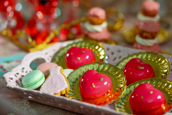 【Dessert】マリーアントワネットが愛したベリーマカロン/ストロベリーシフォンケーキ/真っ赤なハートのベリームース/花嫁の帽子ルリジューズ/ホワイトチョコムース ア・ラ・ヴェルサイユ/ベリーと白ワインのジュレ/ベリーロールケーキ/ベリーたっぷりタルトレット/イチゴショートケーキ/プリンセスクッキー/アイスクリーム/カラフルロリポップ/バラのフィナンシェ/チョコレートフォンデュ