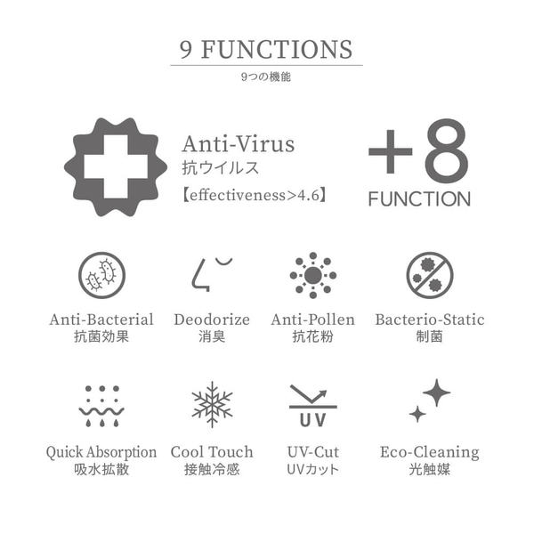 「抗ウイルス」「抗菌防臭」「消臭」「抗花粉」「制菌」「吸水拡散」「接触冷感」「UVカット(遮熱)」「光触媒(エコクリーニング)」の9つの機能が付与された、一般的な布地マスクとは一線を画した清潔仕様の洗えるマスクです。