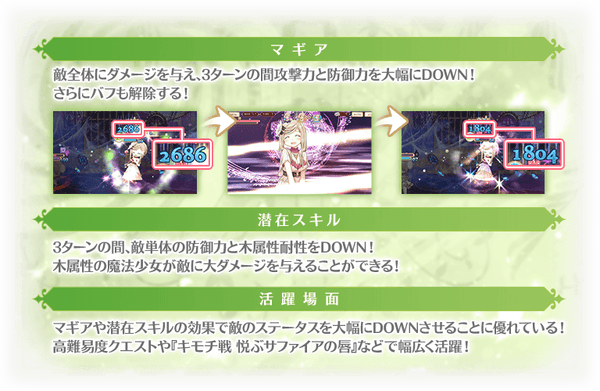 『木属性魔法少女 ピックアップガチャ』では下記ピックアップ対象の魔法少女の提供割合がアップしております。