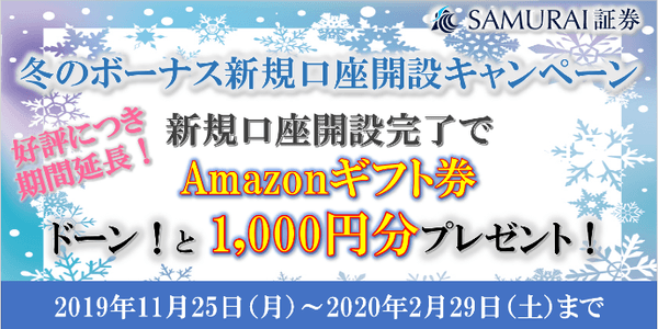 2020年2月29日(土)までに新規口座開設(無料)を完了されたお客様を対象に、Amazonギフト券1,000円分をプレゼントいたします。ぜひ新規口座開設をご検討ください。