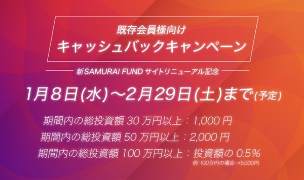 「SAMURAI FUND」サイトリニューアルを記念し、2020年2月29日(土)までに投資いただいたお客様を対象に、最大で期間内の総投資額の0.5%をキャッシュバックいたします。
