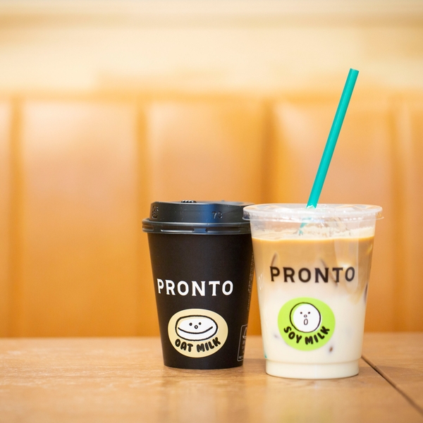 カスタムで植物由来のソイミルクやオーツミルクに変更することができるプロントのカフェラテ。カフェラテ以外にもミルクを使用している対象ドリンクのミルクをソイミルクまたはオーツミルクに変更いただけます。ミルク変更がわかるようにカップに貼られたシールもかわいい、プロントの新商品です。