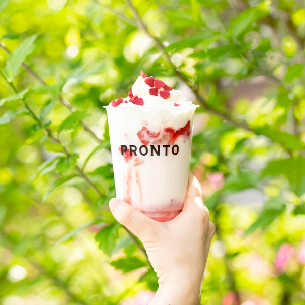 プロントの新作「リッチストロベリーミルク」シリーズは、いちご果肉入りストロベリーミルクに、たっぷりのホイップクリームとハート形のチョコレートをトッピングしました。“いちご狩り”の楽しさを表現したプロントの新作ドリンク。5月末までの季節限定ドリンクを是非お楽しみください。