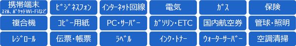 ※品目 は 、 インタネット 回線 、 コピー用紙、ガソリン・ ETC 、国内航空券、管球・照明、レジロール、伝票・帳票、ラベル、インクトナー、ウォーターサーバーなど