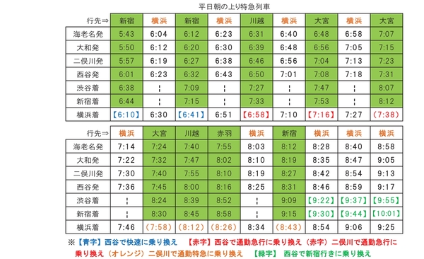 また、朝の時間帯の一部列車は新宿から先の池袋・赤羽・武蔵浦和・大宮方面(最遠は川越)へも運行し、相鉄線沿線から多方面へのアクセスが向上します。