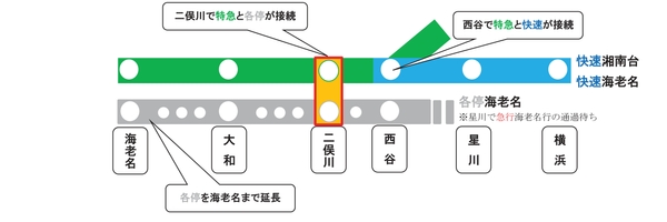 湘南台~横浜間の特急を海老名~横浜間に変更し、海老名~横浜間の特急を1時間当たり3本にします。また、JR直通列車は1時間2本のうち1本を特急として運転し、西谷で横浜行きと接続するダイヤとします。これにより海老名発基準では1時間当たり4本の特急を運行することで、海老名・大和~横浜間の利便性を高めます。