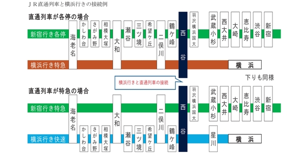 これにより横浜発急行の本数が減少しますが、新宿発特急と横浜発快速が西谷で接続することで、横浜~海老名間の速達性を向上します。