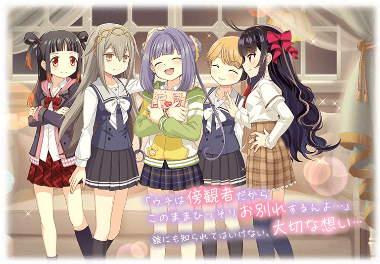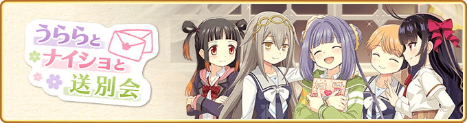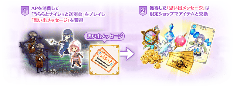 本イベントで獲得した「思い出メッセージ」は限定メモリア「ショータイムなんよ!」や限定ホーム背景「うららとナイショと送別会」「ガチャチケット」等の貴重なアイテムと交換できます。