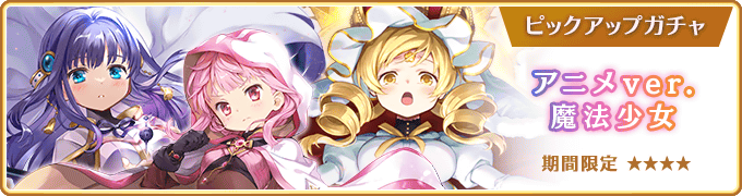 『期間限定 アニメver.魔法少女 ピックアップガチャ』では、下記ピックアップ対象の魔法少女およびメモリアの提供割合がアップしております。