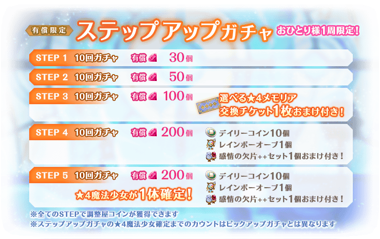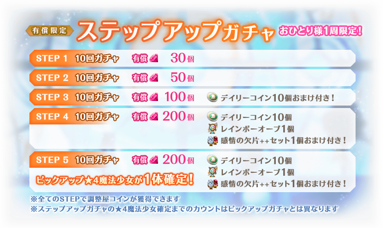 ※『有償限定 ステップアップガチャ 有愛うらら編』の★4魔法少女確定までのカウントは『有愛うらら ピックアップガチャ』とは異なります。