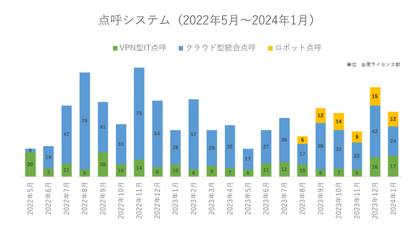 この度、従来型IT点呼製品に加え、新製品のクラウド点呼製品、自動点呼システムを併せた合計の導入実績(2023年2月~2024年1月 *1)をお知らせ致します。 ここ1年の点呼システム製品(3製品)の総出荷数(ライセンス数)は556(*2)となり、前年より減少しました。