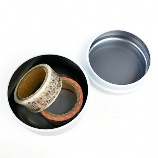 缶はこんな感じです。つるりとして綺麗ですね。オフィスなんかで、クリップを入れるのも良さそう。例えば、マスキングテープをいれてみました。