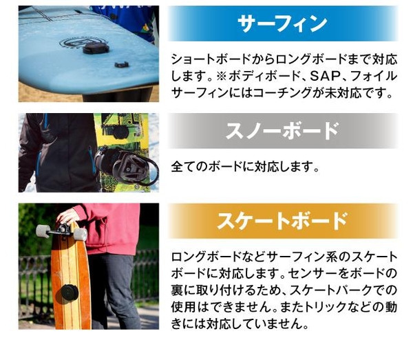 A.ライドコネクトが対応できるのは、ショートボード(スラスター、ツインまたはクワトロ)からロングボードまでのあらゆるボードに対応可能です。ただし以下のボードはコーチング機能が対応できておらず、 対応していません。SUPサーフィン、フォイルサーフィン、ボディーボード。