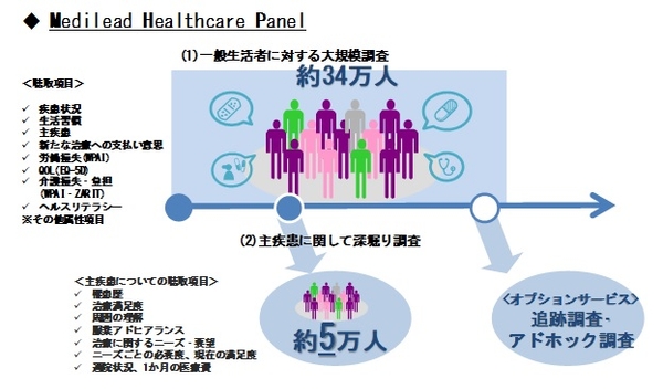 株式会社クロス・マーケティンググループ(本社:東京都新宿区、代表取締役社長兼CEO:五十嵐幹、東証一部3675)のグループ会社である株式会社メディリード (本社:東京都新宿区、代表取締役社長:亀井晋、以下当社)は、2018年調査に引き続き全国の男女を対象に「Medilead Healthcare Panel(以下「MHP」)構築調査」を実施し、一般生活者約34万人の疾患情報パネルを更新しました。本パネルは直近一年以内に入通院歴のある方約13万人、同期間に入通院歴のない方約20万人で構成されており、アンケートパネルとして利用できるだけでなく、インサイト獲得を目的としたコホート研究(集団の追跡)などの縦断研究における分析にも十分に耐えうる疾患情報パネルとして、国内最大規模となります。また、2018年に引き続き回答を得られた方は約14万人であり、この14万人については2018年との比較が可能です。