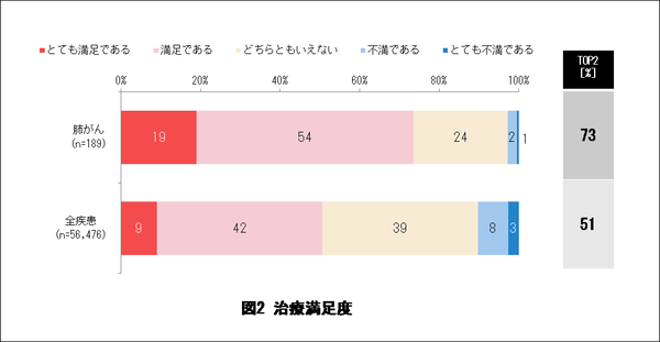 肺がん患者さんのうち、治療に対して「とても満足である」「満足である」と答えた割合は73% であり、全体平均より高くなっていた。<図2>