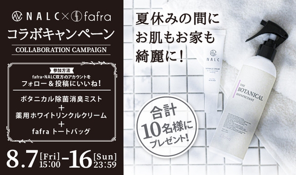 「人類が使うべきコスメ」をコンセプトに、「真に実力のあるコスメ」を提供していく、ジェンダーレスコスメブランド『NALC(ナルク)』(株式会社NALC :大阪府大阪市)とデイリーライフスタイルブランド『 fafra(ファフラ)』(株式会社G.Oホールディングス(大阪府大阪市))は、皆さんの夏休みのおうち時間を、より有意義なものにして欲しいという思いから、両ブランドの話題の新商品『NALC 薬用ホワイトリンクルクリーム』『fafra ボタニカル除菌消臭ミスト』をプレゼントするコラボキャンペーンをInstagramにて開催いたします。