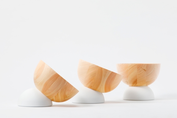 ヒノキの集成材から削り出されたボウルが、半球状のベースに自由な位置で固定できます。