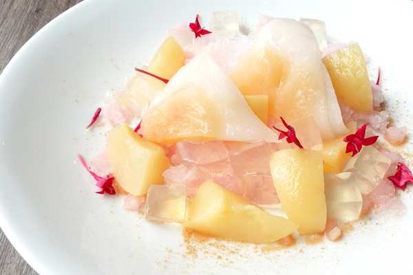 暑い夏に食べたくなる冷んやりスイーツといえばかき氷。“生八ッ橋入り 桃づくしかき氷”は、桃味のかき氷に、白ワインとシナモンで煮た桃のコンポート、桃の寒天、井筒八ッ橋本舗の夏季限定八ッ橋「夕子 黄桃」を組み合わせ、一皿に色々な「桃」を詰め込んだ、最後まであきのこないかき氷です。ドーム型のグラスを取ると、お皿に広がるかき氷の中から生八ッ橋が顔を覗かせます。京都銘菓生八ッ橋の冷たくツルッとした食感と、桃が織りなす爽やかな夏の味をお楽しみください。