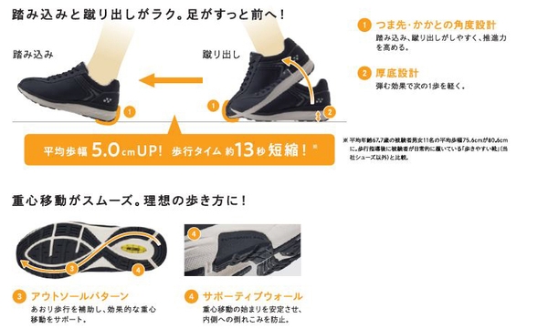 「LC103」「MC103」は、ロコモティブシンドローム(運動器症候群)の改善に有効とされる理想のウォーキングをサポートする機能「ロコ・ストライド」を採用。つま先とかかとに角度をつける設計等が、前方への推進力を高め、無理なく自然に歩幅と歩行スピードを向上させ運動効果を高めます。