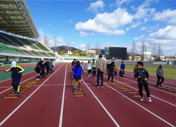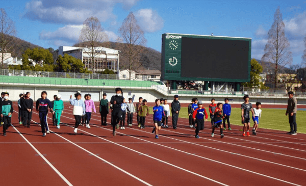 1月25日(土)、岡山県総合グラウンド コンソーシアム・チーム岡山が主催する「かけっこ教室」がシティライトスタジアムにて開催されました。本教室は小学3〜6年生を対象に実施され、本学陸上部、品田直宏監督(本学講師)が講師を務めました。