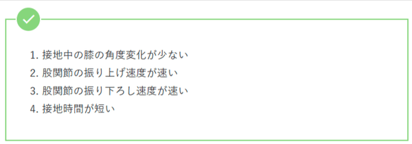 成長期の子どもたちは、たとえ間違った動作であっても、身長の伸びや筋力の向上によってパフォーマンスが上がることがあります。しかし、一度身についてしまった間違った動作の癖を修正することは難しく、中学生以降のパフォーマンス向上を妨げるだけでなく、怪我のリスクも高まります。そのため、「スポーツを楽しむこと」と「遊びの中で正しい動作を身につけること」が、この年代の指導では、特に大切にしたいポイントです。下記は「速く走る選手の特徴」です。