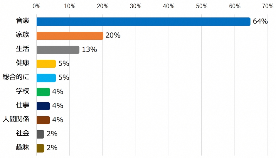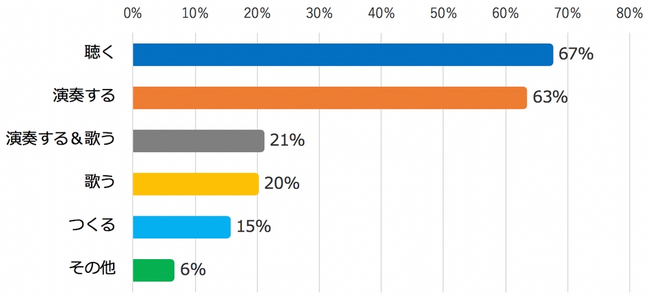 「聴く」「演奏する」が60%を超え、「もっとライブやコンサートに行く」「新しい曲や楽器に挑戦したい」「発表の場を増やしたい」などのコメントが寄せられました。また、「つくる」の中には「オリジナル曲をYouTubeなどで公開したい」というコメントもありました。「その他」は「子供の吹奏楽部を応援する」や「ウクレレ仲間を見つけたい!」「舞う」などの回答をいただいています。総じて、音楽にまつわる新しい目標に挑戦して、人生を楽しみたいという傾向がありました。
