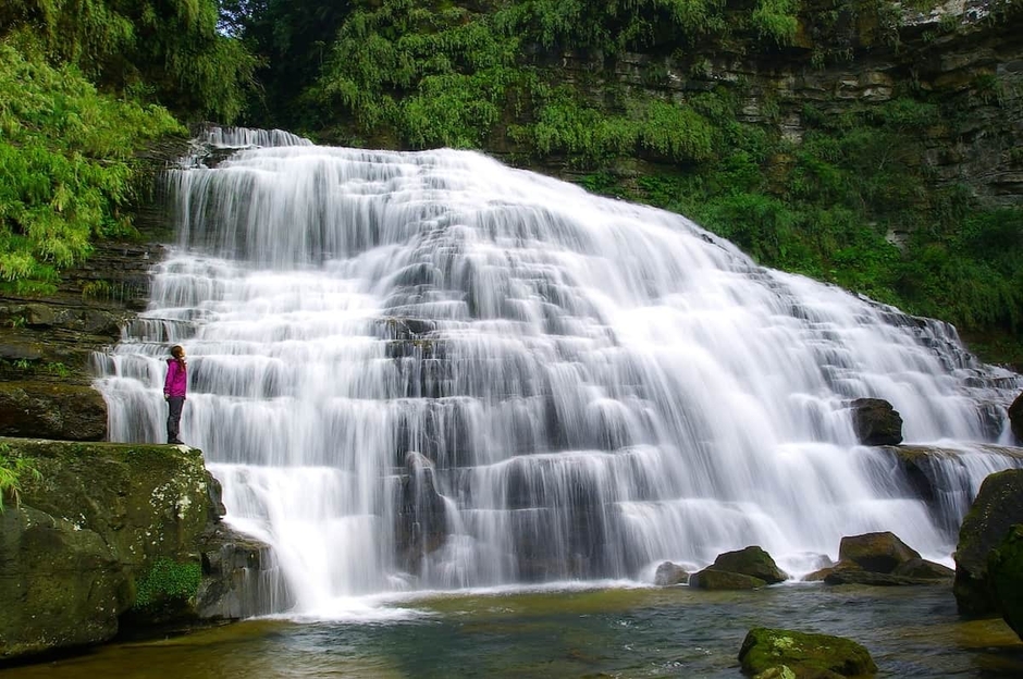 城壁のように見える滝の地層と、階段状の斜面を扇形に広がりながら水が流れ落ちる様は、西表島に数ある滝の中でも最も美しいです。滝の地層が階段状に削られているため、水しぶきの中、頂上まで登ることができるのもこの滝の特徴です。落差10mの滝のてっぺんからはジャングルを見渡すことができます。