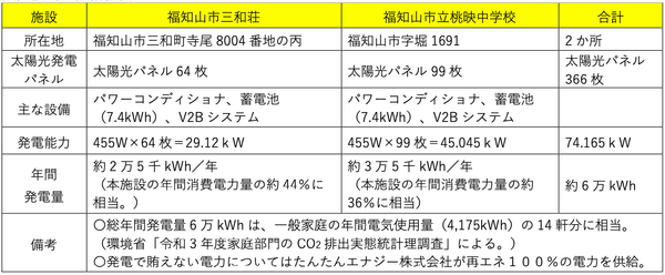 これまで2021年度に福知山市内にある三段池公園総合体育館・福知山市武道館・福知山市学校給食センター、2022年度に南陵中学校・夜久野支所の5地点の公共施設に合計約518kWの太陽光発電設備や蓄電池などを設置し、稼働後は順調に電気を供給しています。