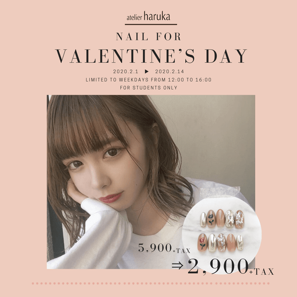 学生限定価格は、バレンタインネイル企画期間の2020年2月1日(土)~2月14日(金)の平日12時~16時のみ!