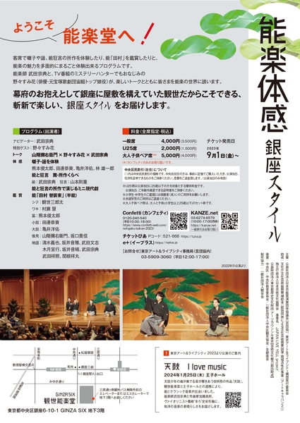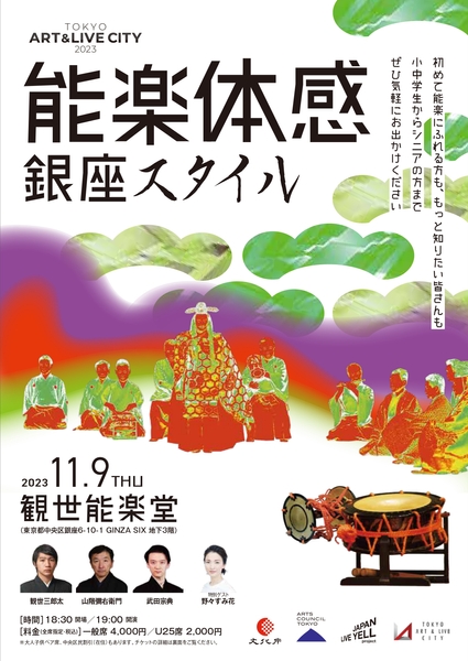 公益社団法人日本芸能実演家団体協議会[芸団協]、東京アート&ライブシティ構想実行委員会主催、『能楽体感 銀座スタイル』が2023年11月9日(木)に二十五世観世左近記念観世能楽堂(東京都中央区銀座6-10-1GINZA SIX 地下3階)にて開催されます。