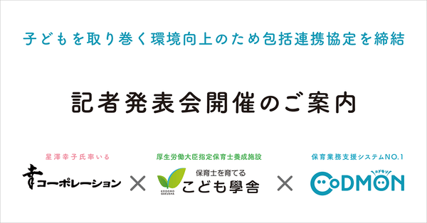星澤幸子氏率いる株式会社幸コーポレーション(本社:北海道札幌市、代表取締役:星澤幸子)と、厚生労働大臣指定保育士養成施設「こども學舎」を運営する特定非営利活動法人進学支援の会(所在地:北海道札幌市、代表理事:河村泰孝)と、保育園業務支援システム「CoDMON(以下コドモン)」を提供している株式会社コドモン(本社:東京港区三田、代表取締役:小池義則)は、この度包括連携協定を締結し、記者発表会を開催いたしますことをお知らせします。