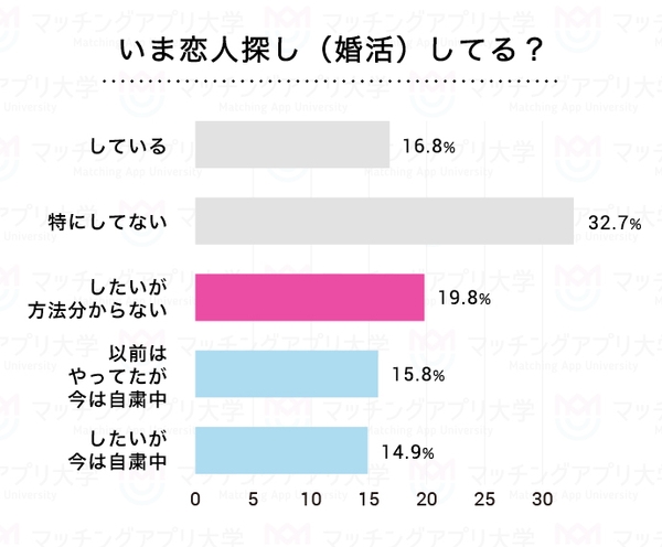 恋人が欲しいと感じている男女に対して、恋人探しはしているかを質問したところ「恋人探しをしたいが方法がわからない」「以前は恋人探しをしていたが今は自粛中」「恋人探しをしたいが今は自粛中」と答えた人の割合は約50%にものぼりました。