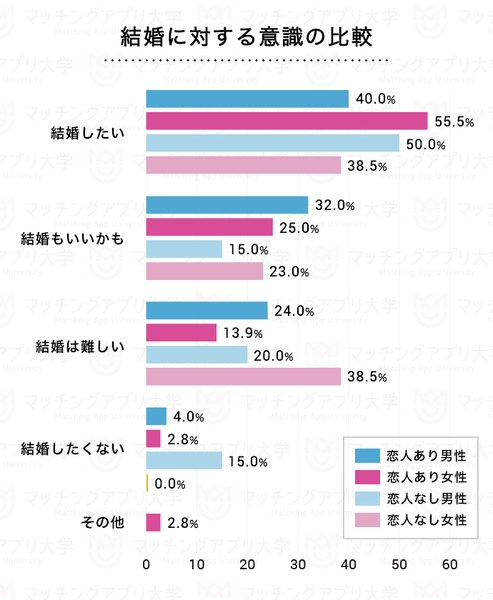 恋人なしの男女は結婚に前向きになった人の方が多いものの、恋人ありの男女に比べて「結婚は難しい」「結婚したくない」と感じるようになった割合が高いのが分かります。