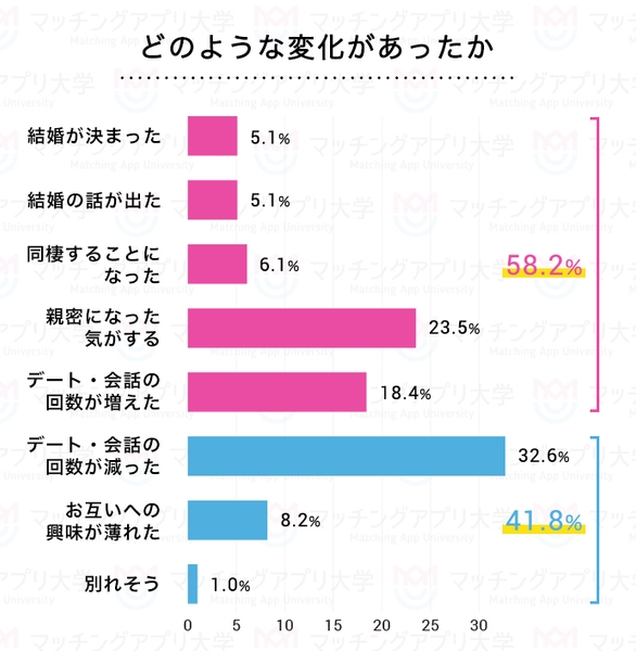 ポジティブな変化をしているカップルが多い一方で、会う頻度が減ってしまったりお互いへの興味がなんとなく薄れてしまったり、関係が疎遠になったカップルが約42%いるのも事実です。