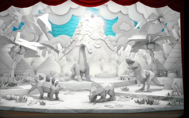 ペーパークラフトのジャングルや恐竜達をカラフルにしたり、火山を噴火させたり。