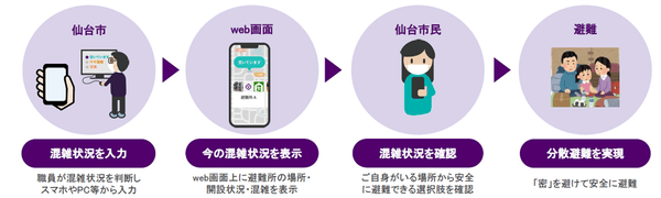 この窓口を通じて、株式会社バカンと連携し、台風や大雨などの風水害発生時に仙台市内195カ所の避難所の混雑状況を配信するサービスの実証実験を7月2日より開始しました。