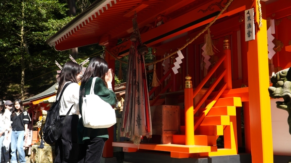伝統的な茶摘み衣装を身にまとい、村のベテランの摘み子さん約80人と共に、丁寧に摘みました。学生たちは、普段飲むお茶の源流にふれたことで、一層お茶への愛着が深まりました。茶摘み後には、南山城村の村長平沼様から労いのお言葉をいただきました。午後からはパワースポットである恋志谷神社(後醍醐天皇にまつわる縁結びの神様)へ参拝しました。
