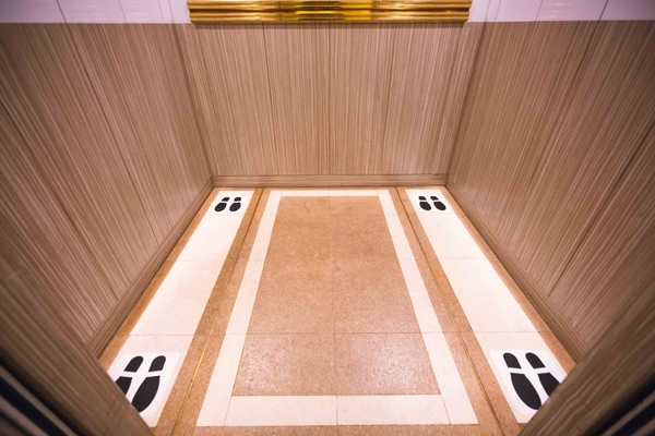 エレベーター内でソーシャルディスタンスを確保できるよう、一度に利用できる人数の制限や、立ち位置を示すマークをつけるなど、各施設で工夫しています。
