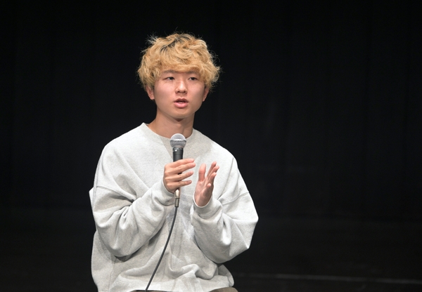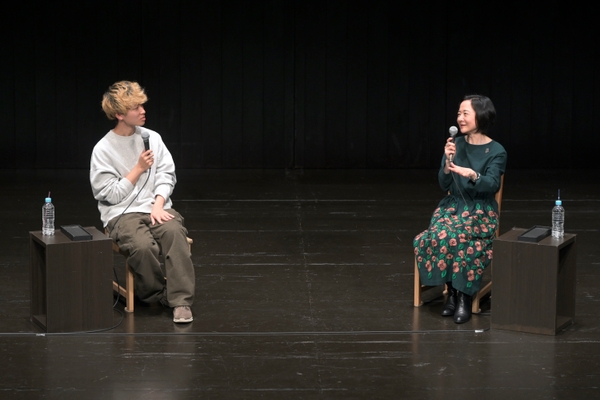 加藤拓也さんは松本で行ったワークショップや、遡ってまつもと市民芸術館総監督の串田和美さんを俳優として迎えた創作についてのエピソードを披露。一方の小川さんは、ミュージカル『レ・ミゼラブル』のツアー最終公演を当館で観劇するために21年秋に訪れたのが初の松本来訪とのこと。加藤さんは現在、松本に滞在しつつ『博士~』の稽古をしており、その疲れを癒すスーパー銭湯のサウナの魅力を熱弁して小川さんと客席の笑いを引き出し、小川さんは今回の訪問で歩いた町の、あちこちに『博士~』のポスターが貼ってあることの嬉しさも語った。