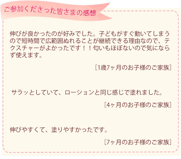 イベントの参加者は0歳児の親子が半数以上。生まれてから初めての夏を迎え、日焼け対策にお悩みの方もたくさんいらっしゃいました。体験会では、アトピタの日焼け止めをお試しいただきました。「クリームだけど、さらっとしていて塗りやすい」との嬉しいお声をたくさんいただきました!