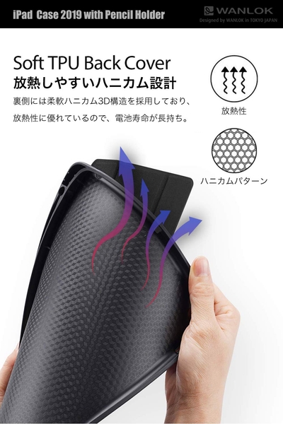 1.【上質な素材とスリムなデザイン】:スリムで軽量、わずか270gのすっきりしたデザイン。裏側には柔軟ハニカム3D構造を採用しており、放熱性に優れています。また、電池寿命を延長させる機能もついています。外側は高級PUレザーで、ipadにぴったり合わせた構造、全面保護、耐摩耗性 傷つきを防止します。穴は特別に加工され、iPadの電源ボタンと音量ボタンもしっかり保護します。