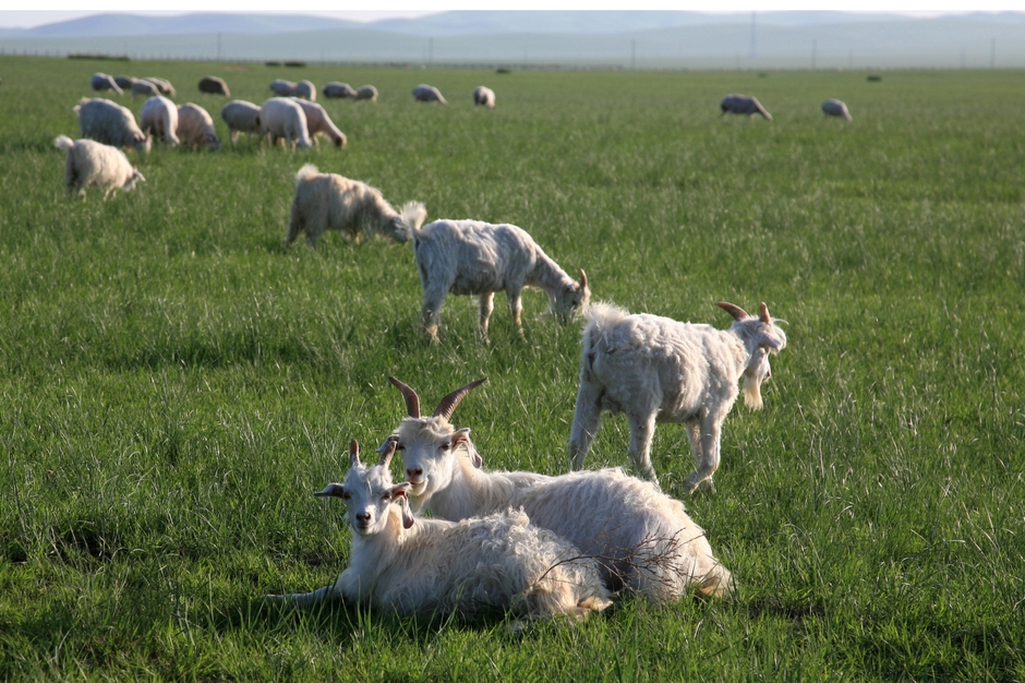 原料となるカシミヤ山羊は、3年以上、化学肥料や化学合成農薬を使用しない土地で育った草などを与えて育てています。