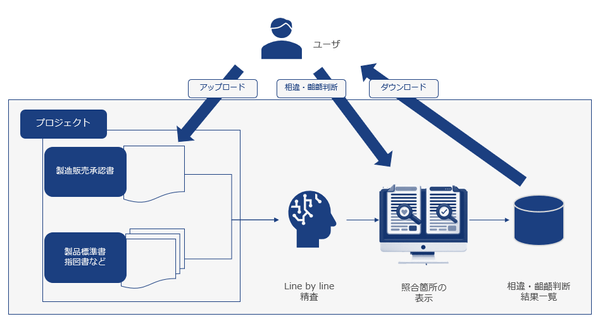 本システムは、AIが製造販売承認書の一節を製品標準書、指図書などの膨大な文章から自動で抽出し照合します。さらに、該当する一節の記載箇所を明示し、QA担当者の相違、齟齬判断をサポートします。
