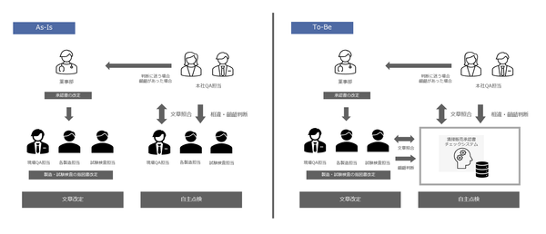 自主点検における製造販売承認書チェックでは、各工程の製造及び試験検査担当者がローテーションを組み、対面でのチェックを行ってきました。製造販売承認書、製品標準書、指図書などの文章を紙に印刷し、製造販売承認書の文章を一節ごとに分けて、膨大な数の製品標準書や指図書の記載内容と比較しながらLine by lineでチェックを進めてきました。