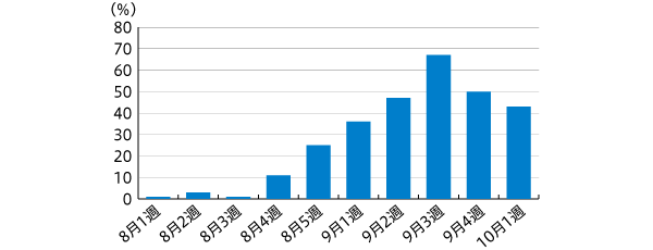 8月1週~10月1週の『増税』関連の掲載数は284件で、掲載のピークは9月でしたが、10月のチラシでもフォローの企画を実施している企業もありました(図2)。