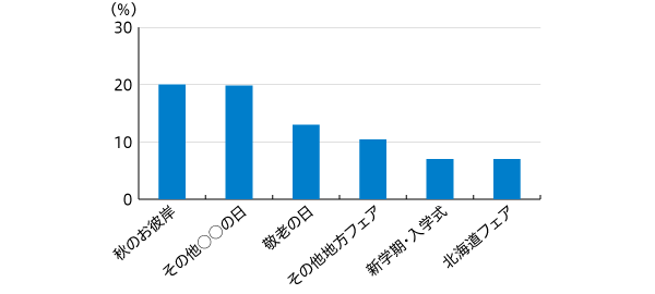 2019年9月にGMS・SMのチラシに掲載された企画は『秋のお彼岸(20.0%)』『その他○○の日(19.8%)』『敬老の日(13.0%)』の順となりました(図1)。記念日等を取得している『その他○○の日』では十五夜が一番多く、対象SM・GMSの中の約半数が企画の掲載を行っていました。また『北海道フェア』が29件(7.0%)となり、他の月と比べて多いことも特徴的でした。